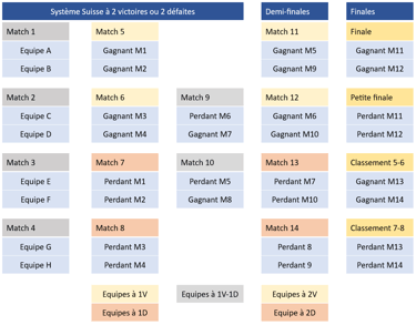 Une équipe qui subit 2 défaites sera placée dans le groupe des défaites pour la suite.
